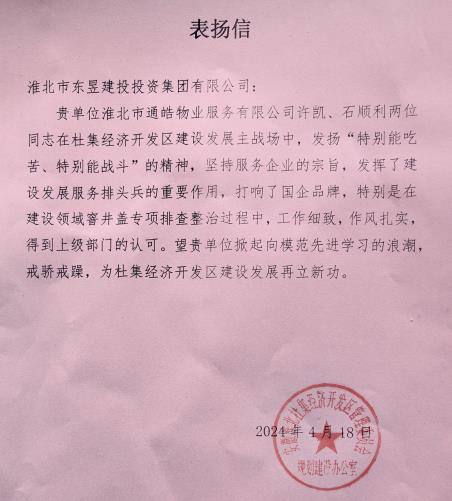 26 04月2024 了解詳情 通皓物業喜獲杜集區經濟開發區委員會表揚信一封 近日,通皓物業收到一封來自業主單位杜集區經濟開發區委員會的表揚信,信中業主單位對我公司良好的工作作風、熱枕的服務意識表示高度贊揚。